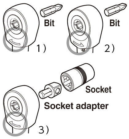2) Use in counterclockwise rotation: Insert the bit/socket adapter from the back, with the side with the CCW rotation arrow (the side without VESSEL stamped on the shaft) facing you.