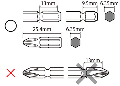 ・Various commercially available 6.35 mm hex screwdriver bits can be used.
