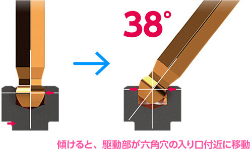 - レンチを傾けると、駆動する位置が六角穴の入り口付近に移動し、